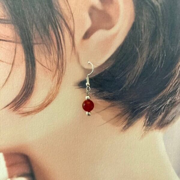 こちらは、8mm玉の赤瑪瑙を使用した一粒フックピアスです。シンプルなデザインはシーン問わず、どんなコーディネートにも合わせ易く使い勝手がいいアイテムです。今回は一粒ピアスの要望が多かった為制作しました。気になる方は是非この機会にどうぞ。