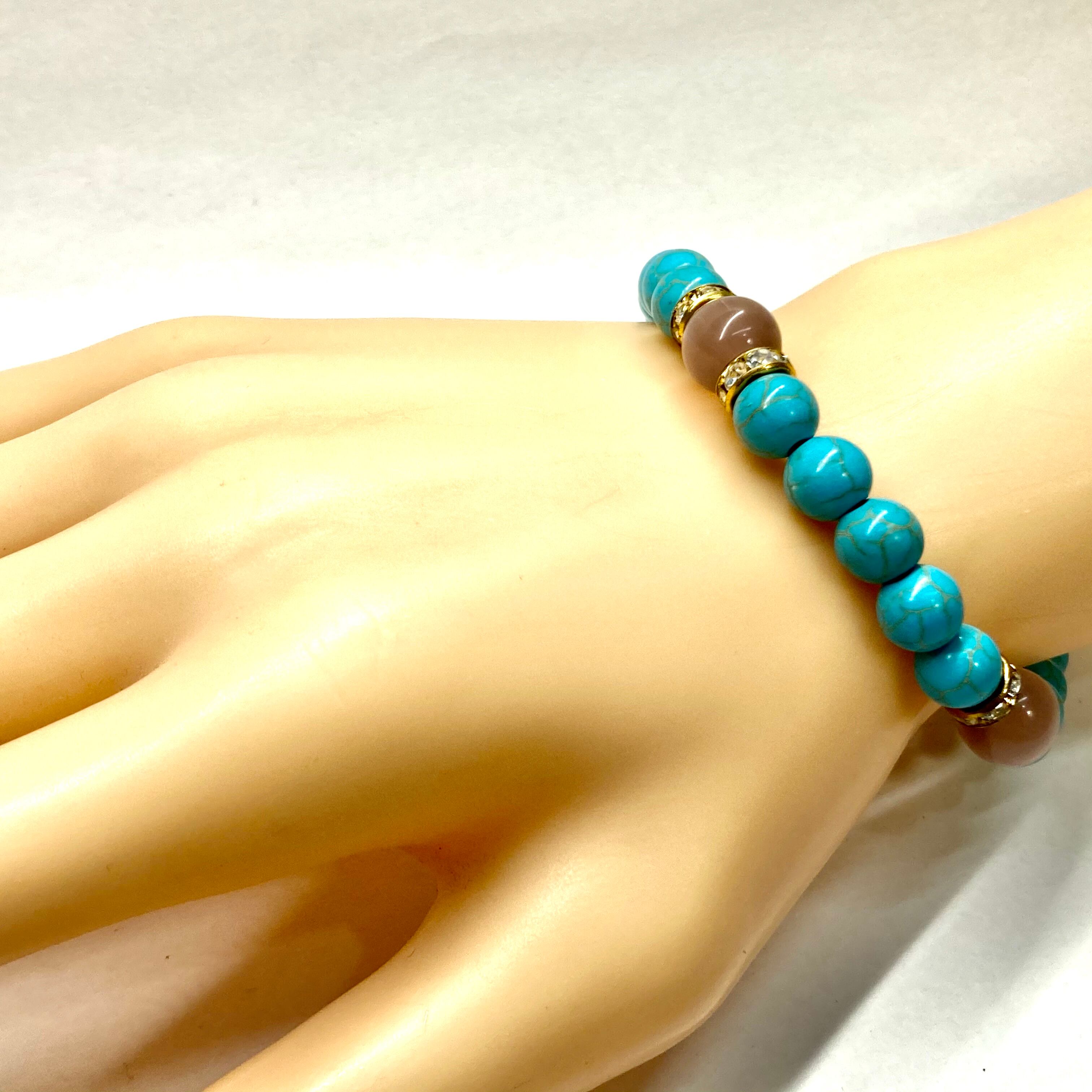 こちらは、8mm玉のキャッツアイとターコイズを使用したパワーストーンブレスレットです。間にはロンデルを挟み高級感ある大人っぽいデザインに仕上がっています。内周約17cmです。気になる方は是非この機会にどうぞ。 【ブレスレット内周サイズ】 内周約17cm 【使用している石、サイズ】 ターコイズ(8mm)・キャッツアイ(10mm) 石は全て浄化済みのものを使っています。