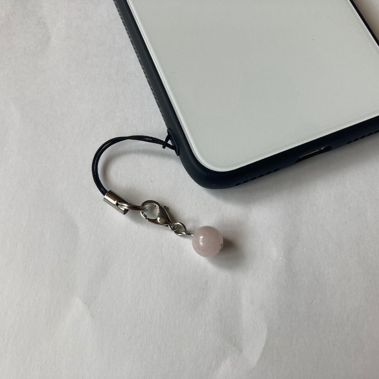 こちらは、8mm玉のローズクォーツを使用した一粒ストラップです。携帯電話にそのまま付けたり、ストラップから取り外しできるデザインに制作しておりますので、ストラップから外してお財布やポーチに付けたり、マスクチャームとも使えるデザインに仕上げています。気になる方は是非この機会にどうぞ。