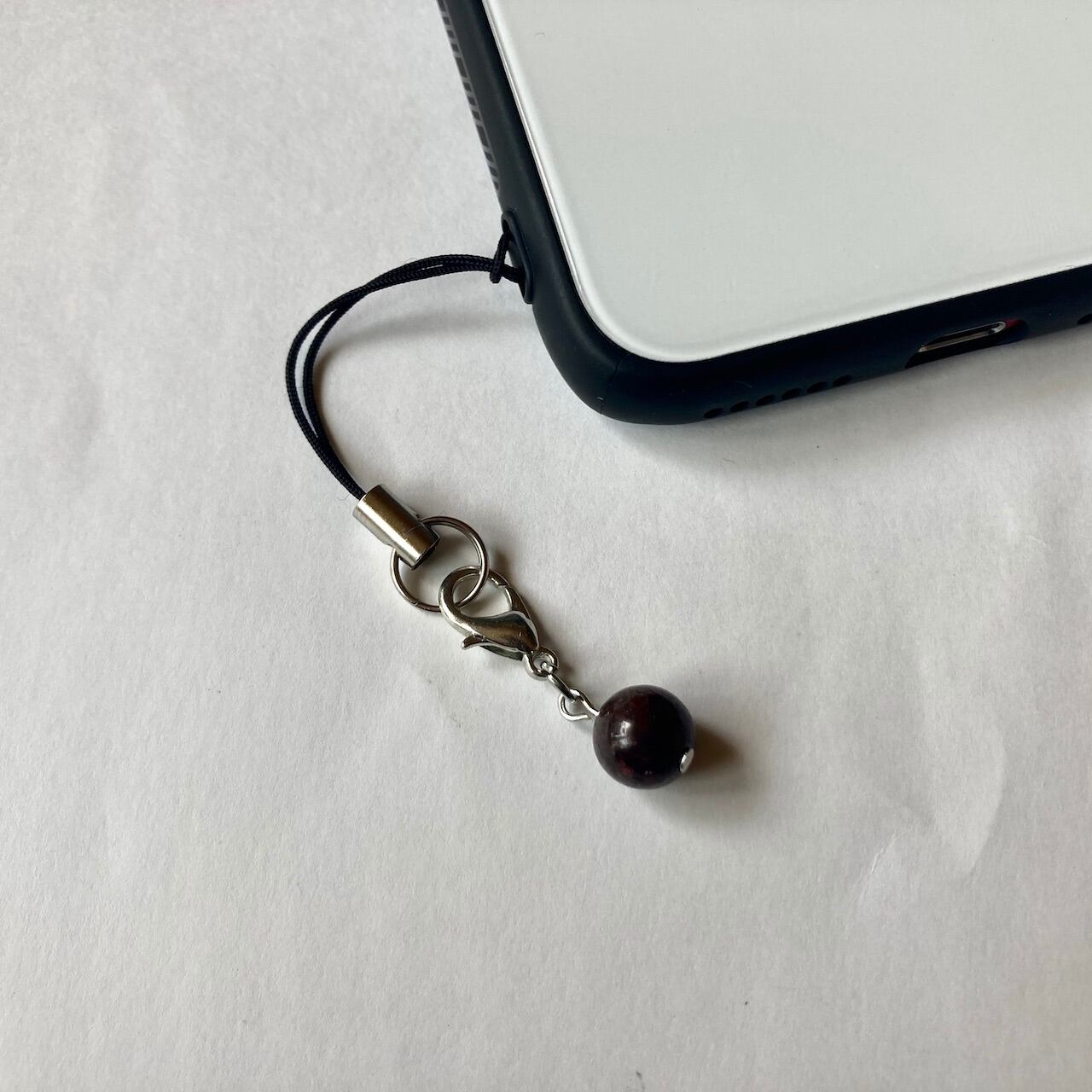 こちらは、8mm玉のガーネットを使用した一粒ストラップです。携帯電話にそのまま付けたり、ストラップから取り外しできるデザインに制作しておりますので、ストラップから外してお財布やポーチに付けたり、マスクチャームとも使えるデザインに仕上げています。気になる方は是非この機会にどうぞ。