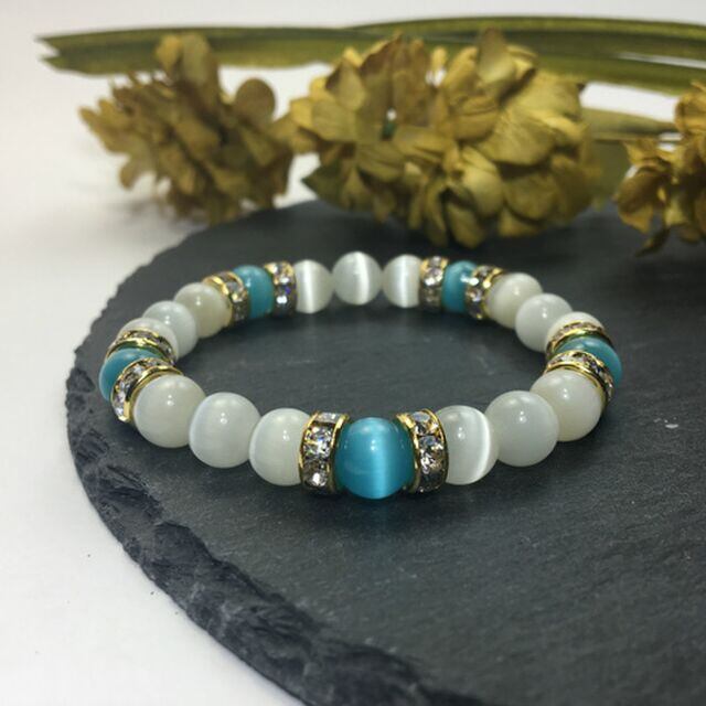 キャッツアイ(ライトブルー×ホワイト) ブレスレット パワーストーン (ゴールド)