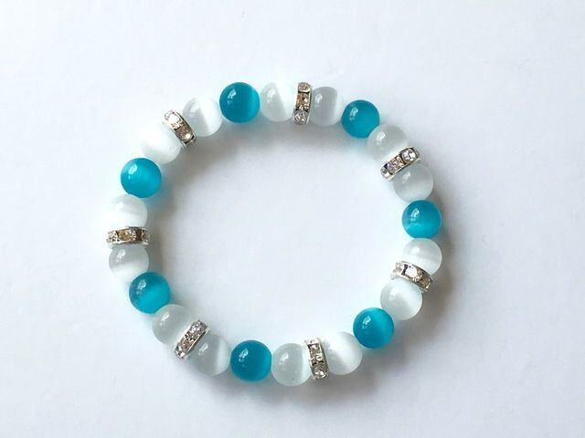 こちらは、8mm玉のライトブルーキャッツアイとホワイトキャッツアイを使用したパワーストーンブレスレットです。間にはシルバーのロンデルを挟み高級感ある大人っぽいデザインに仕上がっています。内周約14cmです。気になる方は是非この機会にどうぞ。
