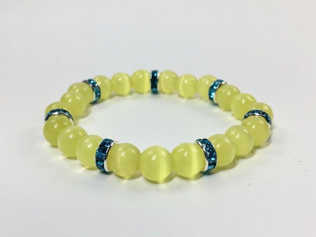 こちらは、8mm玉のイエローキャッツアイを使用したパワーストーンブレスレットです。間にはライトブルーのロンデルを挟み高級感ある大人っぽいデザインに仕上がっています。内周約14cmです。気になる方は是非この機会にどうぞ。