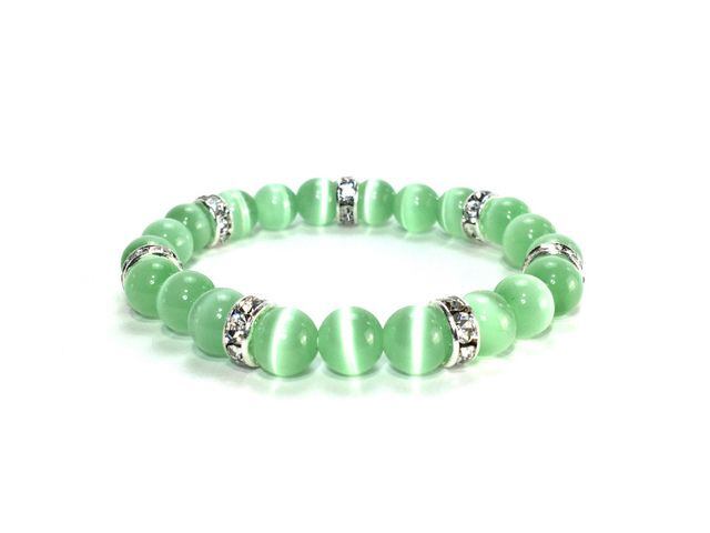 こちらは、8mm玉のライトグリーンキャッツアイを使用したパワーストーンブレスレットです。間にはシルバーのロンデルを挟み高級感ある大人っぽいデザインに仕上がっています。内周約14cmです。気になる方は是非この機会にどうぞ。