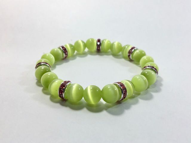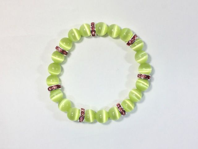 こちらは、8mm玉のライムグリーンキャッツアイを使用したパワーストーンブレスレットです。間にはピンクのロンデルを挟み高級感ある大人っぽいデザインに仕上がっています。内周約14cmです。気になる方は是非この機会にどうぞ。