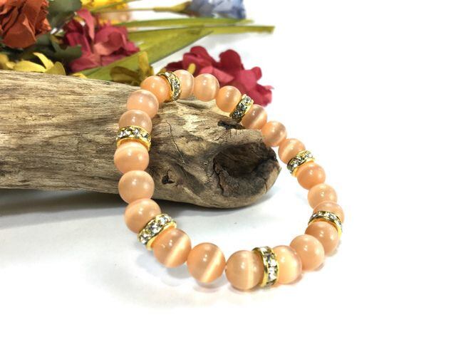 こちらは、8mm玉のオレンジキャッツアイを使用したパワーストーンブレスレットです。間にはゴールドのロンデルを挟み高級感ある大人っぽいデザインに仕上がっています。内周約14cmです。気になる方は是非この機会にどうぞ。
