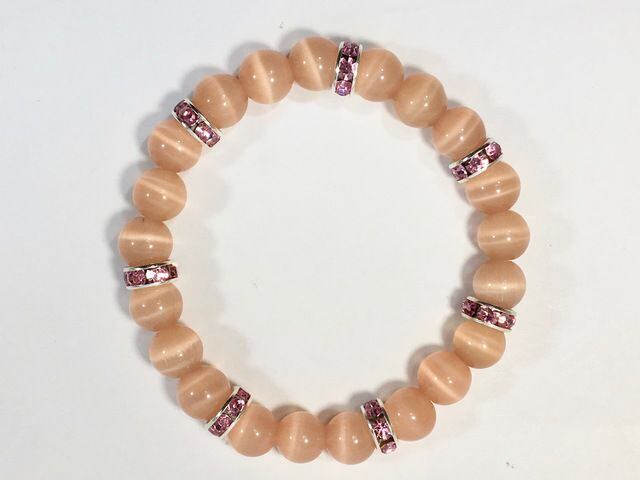 こちらは、8mm玉のオレンジキャッツアイを使用したパワーストーンブレスレットです。間にはピンクのロンデルを挟み高級感ある大人っぽいデザインに仕上がっています。内周約14cmです。気になる方は是非この機会にどうぞ。