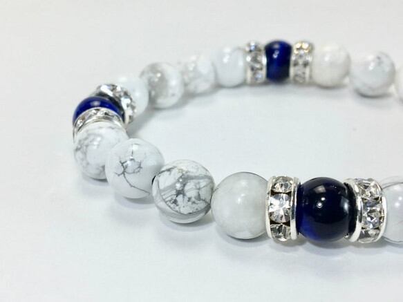 こちらは、8mm玉のブルータイガーアイとハウライトを使用したパワーストーンブレスレットです。間にはロンデルを挟み高級感ある大人っぽいデザインに仕上がっています。内径約15cmです。気になる方は是非この機会にどうぞ。