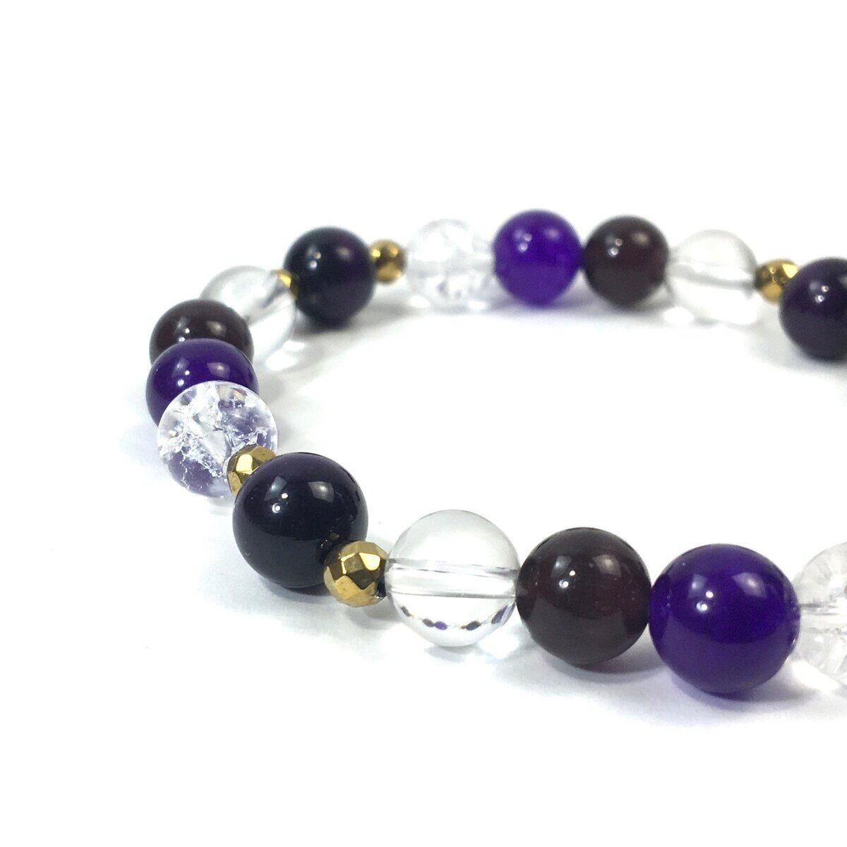 こちらは、8mm玉のパープルタイガーアイ、キャッツアイ、水晶、ジェイド、クラック水晶を使ったパワーストーンブレスレットです。今回は石との間にはゴールドのヘマタイトを加えアクセントとしております。今回は5種の石を使い可愛らしいデザインに仕上げています。サイズは内周 約16cm(手首周りを測り少し余裕をもってお買い求めくださいませ) 気になる方は是非この機会にどうぞ。