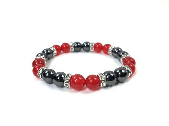 こちらは、8mm玉のジェイド(レッド)とヘマタイトを使用したパワーストーンブレスレットです。間にはロンデルを挟み高級感ある大人っぽいデザインに仕上がっています。サイズは内周約15cmです。気になる方は是非この機会にどうぞ。