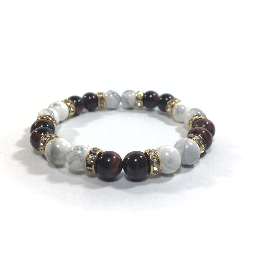 こちらは、8mm玉のハウライトとタイガーアイを使ったパワーストーンブレスレットです。シンプルなデザインでどんなコーディネートにも合わせやすいデザインに仕上げています。サイズは内周約15cmです。気になる方は是非この機会にどうぞ。