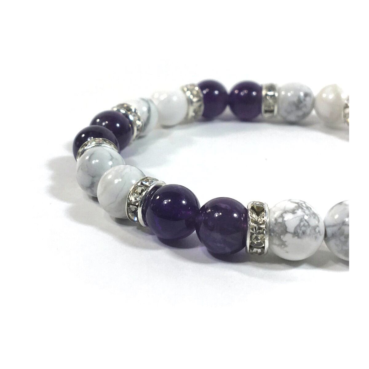こちらは、8mm玉のハウライトとアメジストを使ったパワーストーンブレスレットです。シンプルなデザインでどんなコーディネートにも合わせやすいデザインに仕上げています。サイズは内周約15cmです。気になる方は是非この機会にどうぞ。