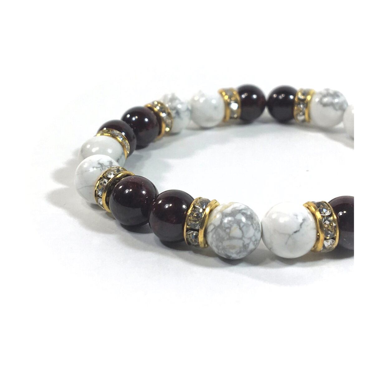 こちらは、8mm玉のハウライトとガーネットを使ったパワーストーンブレスレットです。シンプルなデザインでどんなコーディネートにも合わせやすいデザインに仕上げています。サイズは内周約15cmです。気になる方は是非この機会にどうぞ。
