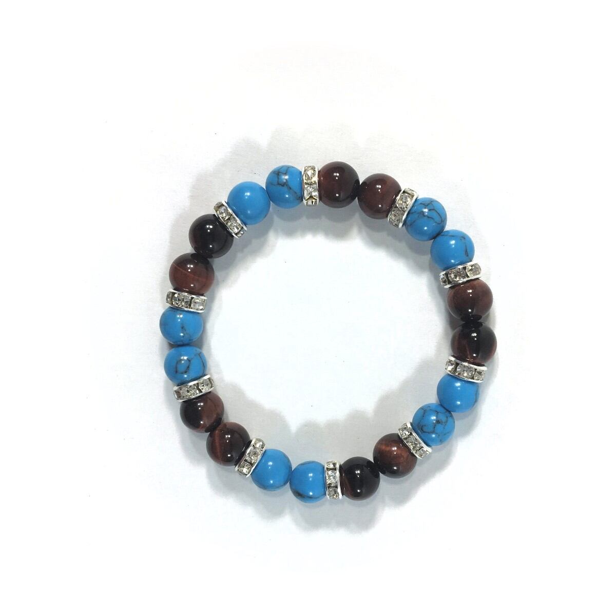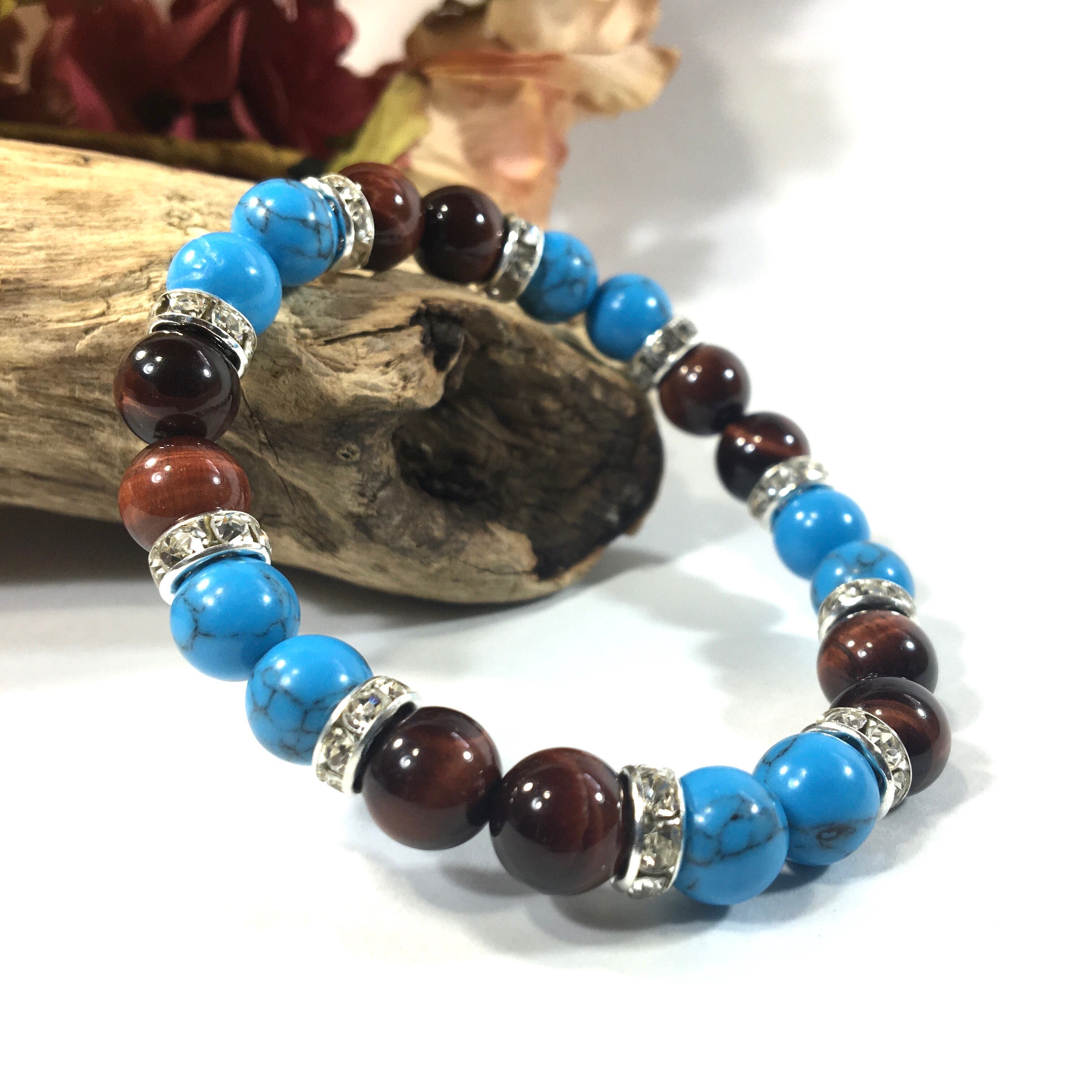 こちらは、8mm玉のターコイズとレッドタイガーアイを使ったパワーストーンブレスレットです。シンプルなデザインでどんなコーディネートにも合わせやすいデザインに仕上げています。サイズは内周約15cmです。気になる方は是非この機会にどうぞ。