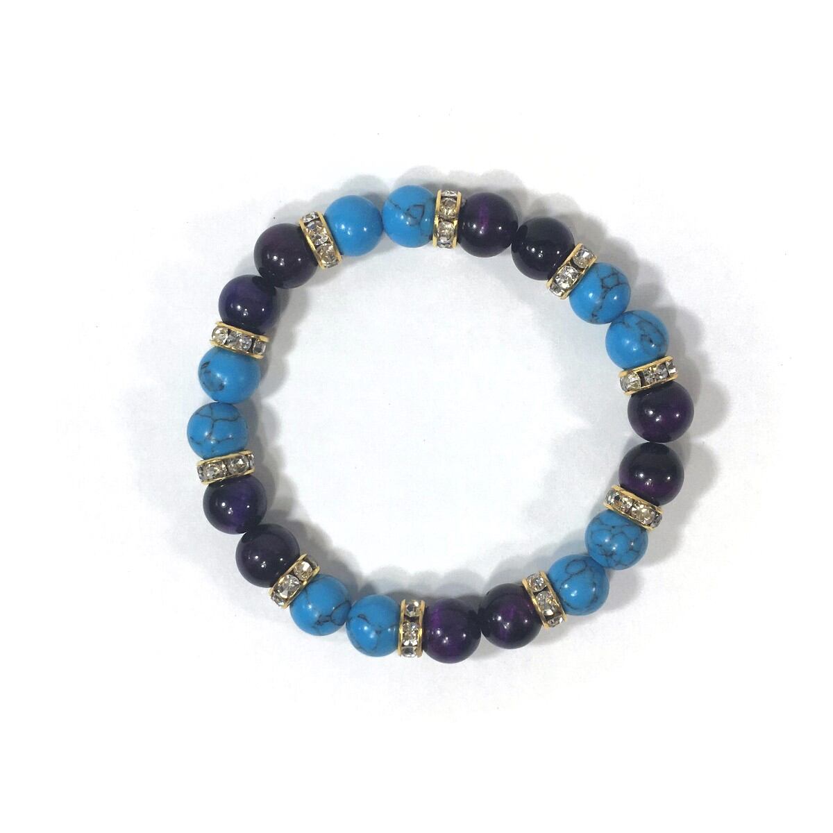 こちらは、8mm玉のターコイズとパープルタイガーアイを使ったパワーストーンブレスレットです。シンプルなデザインでどんなコーディネートにも合わせやすいデザインに仕上げています。サイズは内周約15cmです。気になる方は是非この機会にどうぞ。