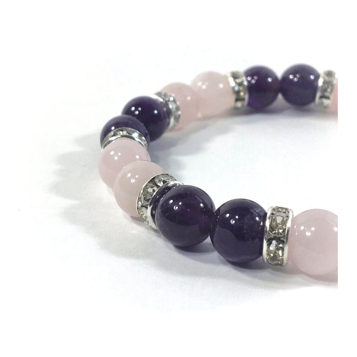 こちらは、8mm玉のローズクォーツとアメジストを使ったパワーストーンブレスレットです。シンプルなデザインでどんなコーディネートにも合わせやすいデザインに仕上げています。サイズは内周約15cmです。気になる方は是非この機会にどうぞ。