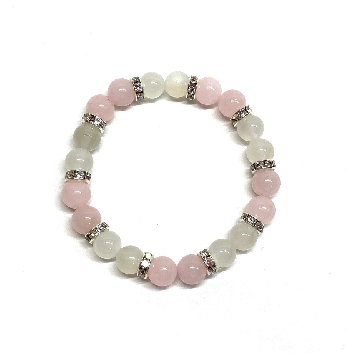 こちらは、8mm玉のムーンストーンとローズクォーツを使ったパワーストーンブレスレットです。シンプルなデザインでどんなコーディネートにも合わせやすいデザインに仕上げています。サイズは内周 約15cmです。気になる方は是非この機会にどうぞ。