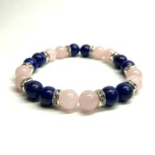 こちらは、8mm玉のラピスラズリとローズクォーツを使ったパワーストーンブレスレットです。シンプルなデザインでどんなコーディネートにも合わせやすいデザインに仕上げています。サイズは内周 約15cmです。気になる方は是非この機会にどうぞ。