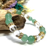 こちらは、8mm玉のアベンチュリンと水晶を使用した天然石ブレスレットです。石との間に挟まれたロンデルがアクセントになったデザインです。サイズは内周約15cmです。
