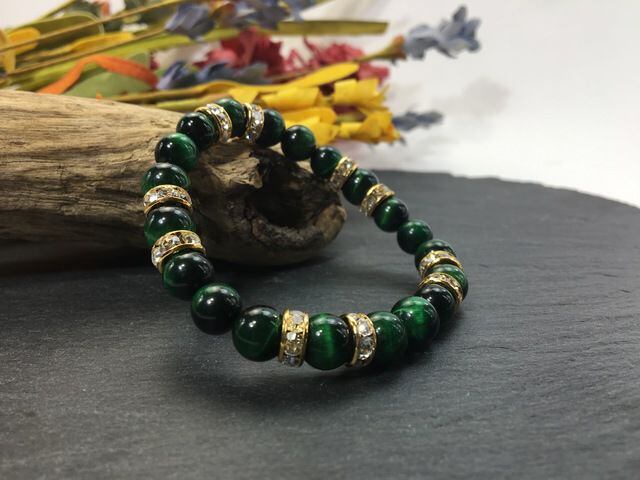 こちらは、8mm玉のグリーンタイガーアイを使ったパワーストーンブレスレットです。シンプルなデザインでどんなコーディネートにも合わせやすいデザインに仕上げています。サイズは内周約15cmです。気になる方は是非この機会にどうぞ。