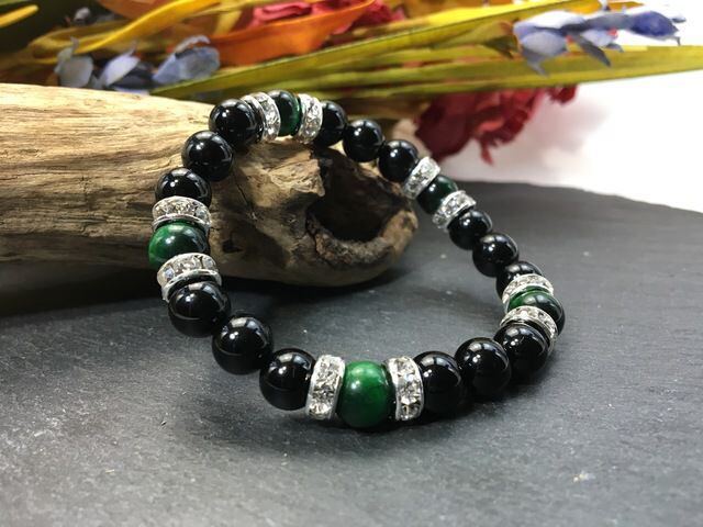 こちらは、8mm玉のオニキスとグリーンタイガーアイを使ったパワーストーンブレスレットです。シンプルなデザインでどんなコーディネートにも合わせやすいデザインに仕上げています。サイズは内周約15cmです。気になる方は是非この機会にどうぞ。