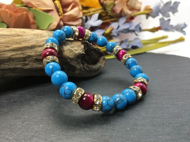 こちらは、8mm玉のターコイズとピンクタイガーアイを使ったパワーストーンブレスレットです。シンプルなデザインでどんなコーディネートにも合わせやすいデザインに仕上げています。サイズは内径約15cmです。気になる方は是非この機会にどうぞ。