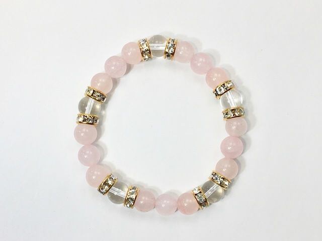 こちらは、8mm玉のローズクォーツと水晶を使ったパワーストーンブレスレットです。シンプルなデザインでどんなコーディネートにも合わせやすいデザインに仕上げています。サイズは内周約15cmです。気になる方は是非この機会にどうぞ。