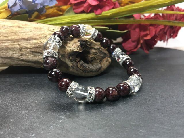 こちらは、8mm玉のガーネットと水晶を使ったパワーストーンブレスレットです。シンプルなデザインでどんなコーディネートにも合わせやすいデザインに仕上げています。サイズは内周約14cmです。気になる方は是非この機会にどうぞ。