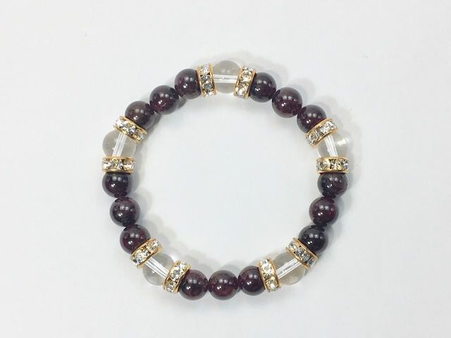 こちらは、8mm玉のガーネットと水晶を使ったパワーストーンブレスレットです。シンプルなデザインでどんなコーディネートにも合わせやすいデザインに仕上げています。サイズは内周約14cmです。気になる方は是非この機会にどうぞ。