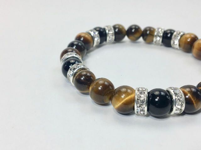 こちらは、8mm玉のタイガーアイとオニキスを使ったパワーストーンブレスレットです。シンプルなデザインでどんなコーディネートにも合わせやすいデザインに仕上げています。サイズは内周約15cmです。気になる方は是非この機会にどうぞ。