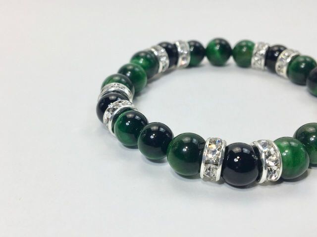 こちらは、8mm玉のグリーンタイガーアイとオニキスを使ったパワーストーンブレスレットです。シンプルなデザインでどんなコーディネートにも合わせやすいデザインに仕上げています。サイズは内周約15cmです。気になる方は是非この機会にどうぞ。