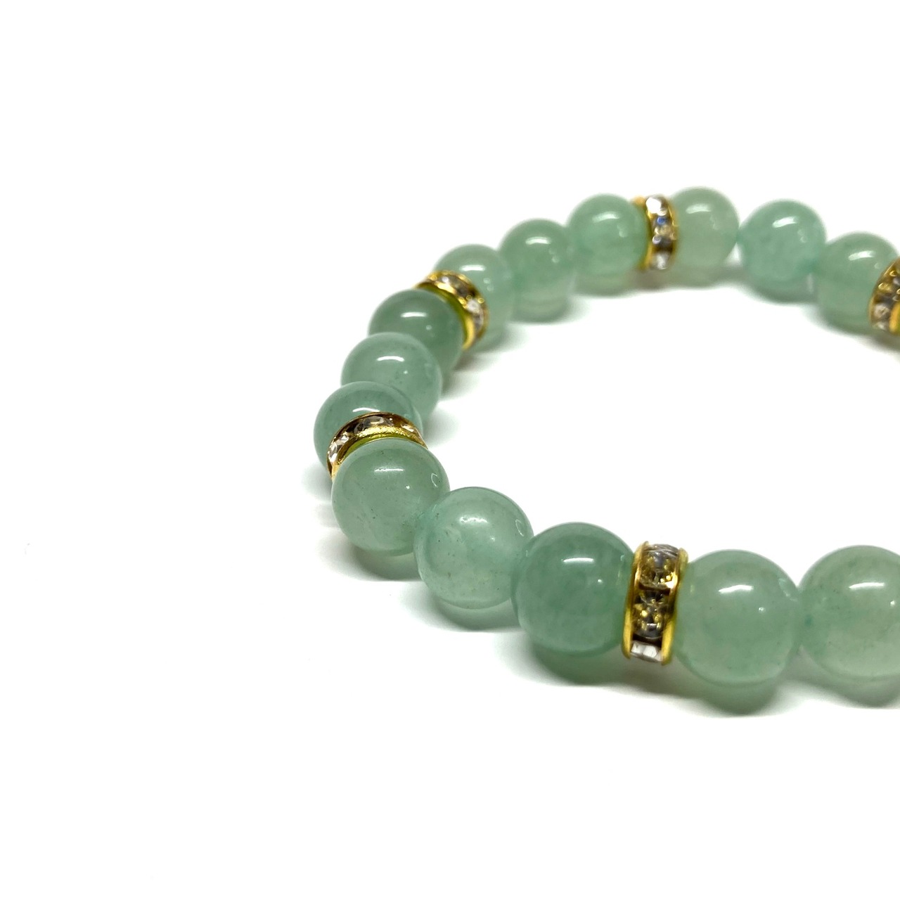 こちらは、8mm玉のアベンチュリンを使ったパワーストーンブレスレットです。シンプルなデザインでどんなコーディネートにも合わせやすいデザインに仕上げています。サイズは内周約15cmです。気になる方は是非この機会にどうぞ。