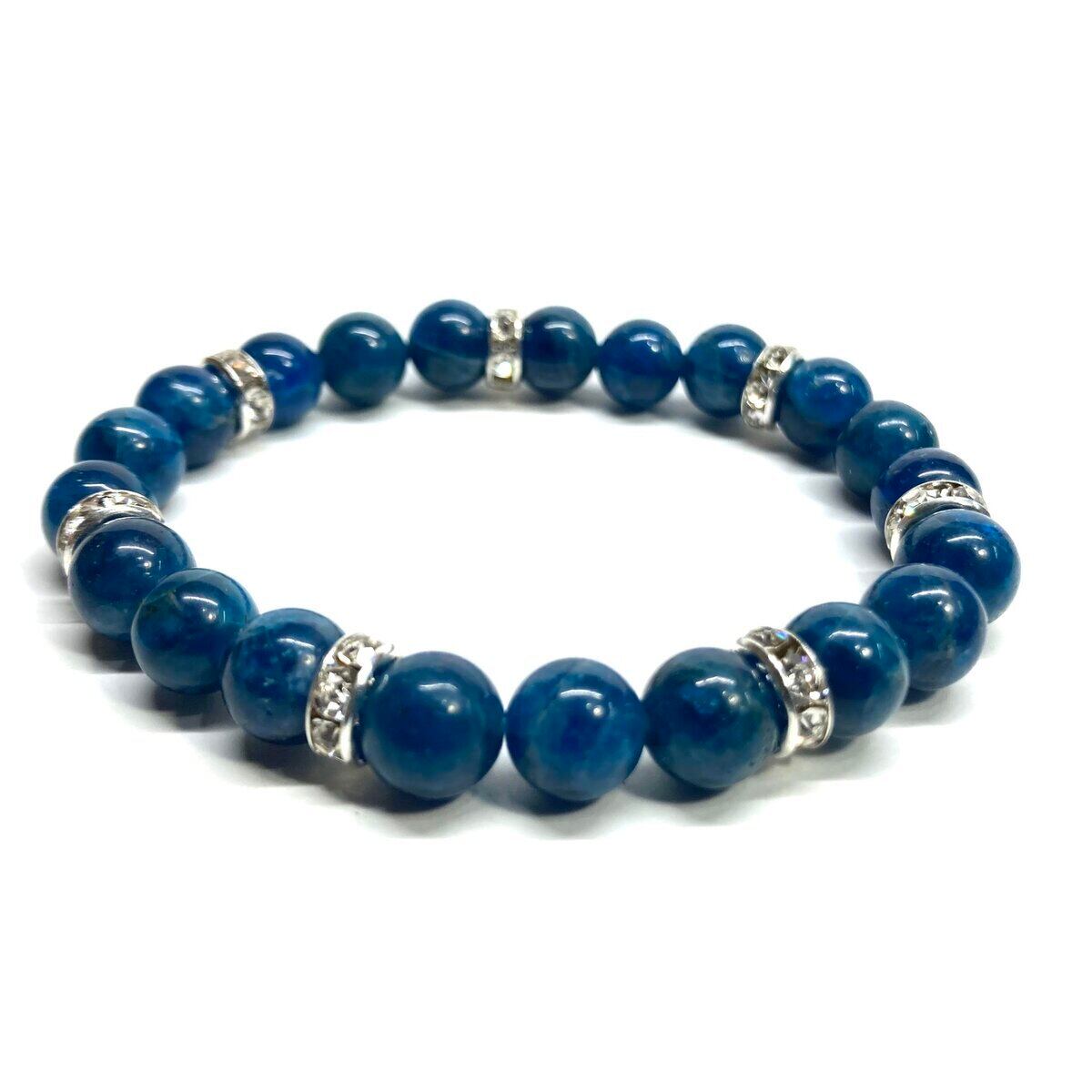 こちらは、8mm玉のアパタイトを使ったパワーストーンブレスレットです。シンプルなデザインでどんなコーディネートにも合わせやすいデザインに仕上げています。サイズは内周約15cmです。気になる方は是非この機会にどうぞ。
