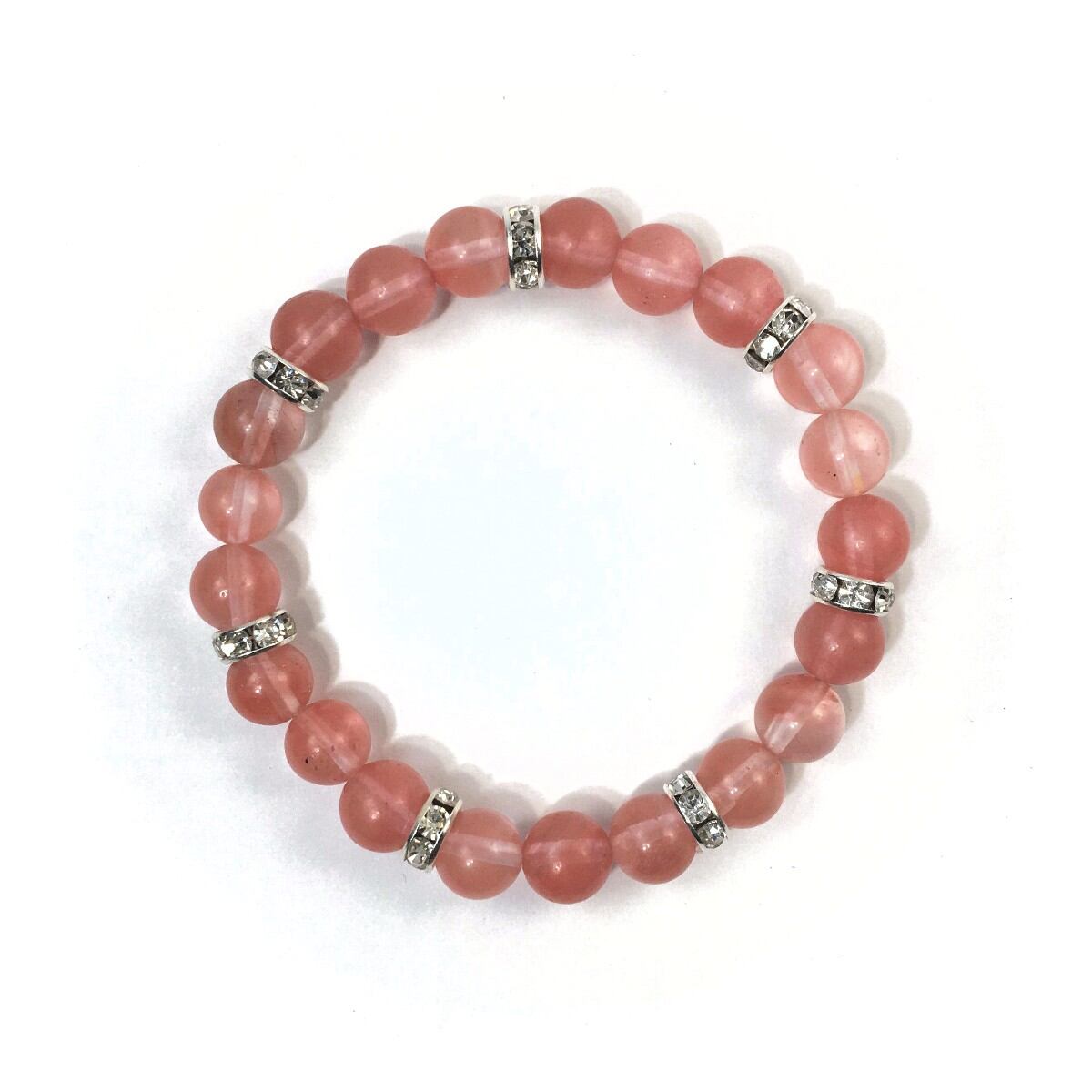 こちらは、8mm玉のチェリークォーツを使ったパワーストーンブレスレットです。シンプルなデザインでどんなコーディネートにも合わせやすいデザインに仕上げています。サイズは内周約15cmです。気になる方は是非この機会にどうぞ。