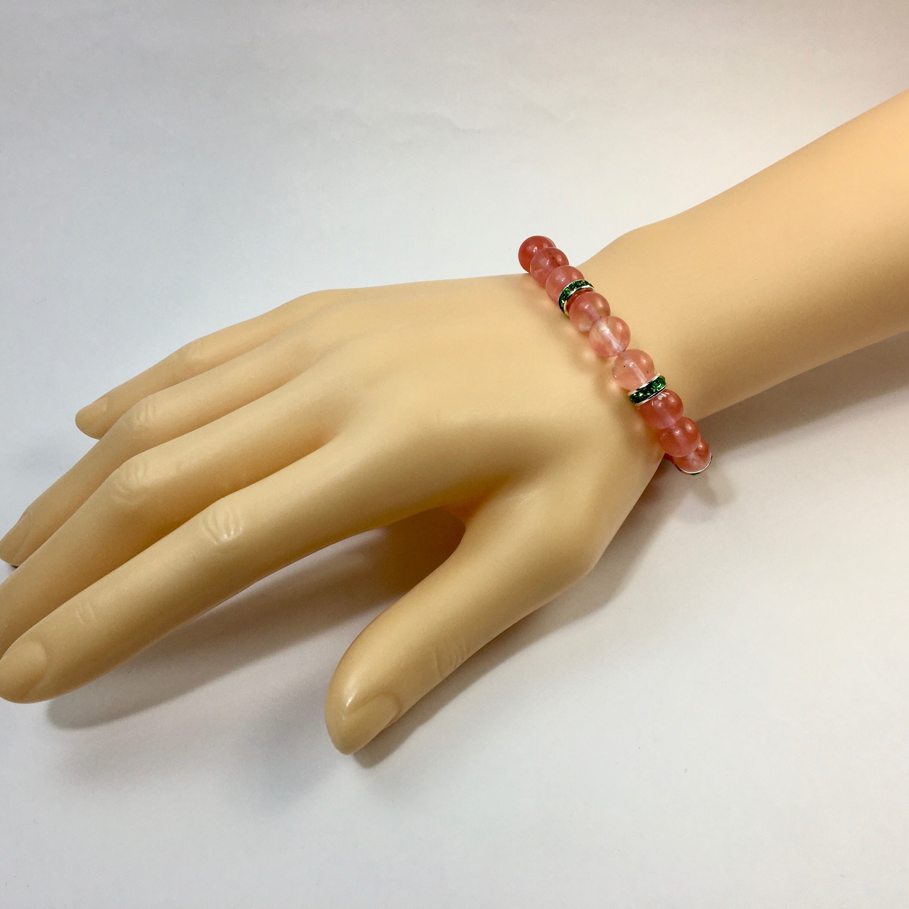 こちらは、8mm玉のチェリークォーツを使ったパワーストーンブレスレットです。シンプルなデザインでどんなコーディネートにも合わせやすいデザインに仕上げています。サイズは内周約15cmです。気になる方は是非この機会にどうぞ。