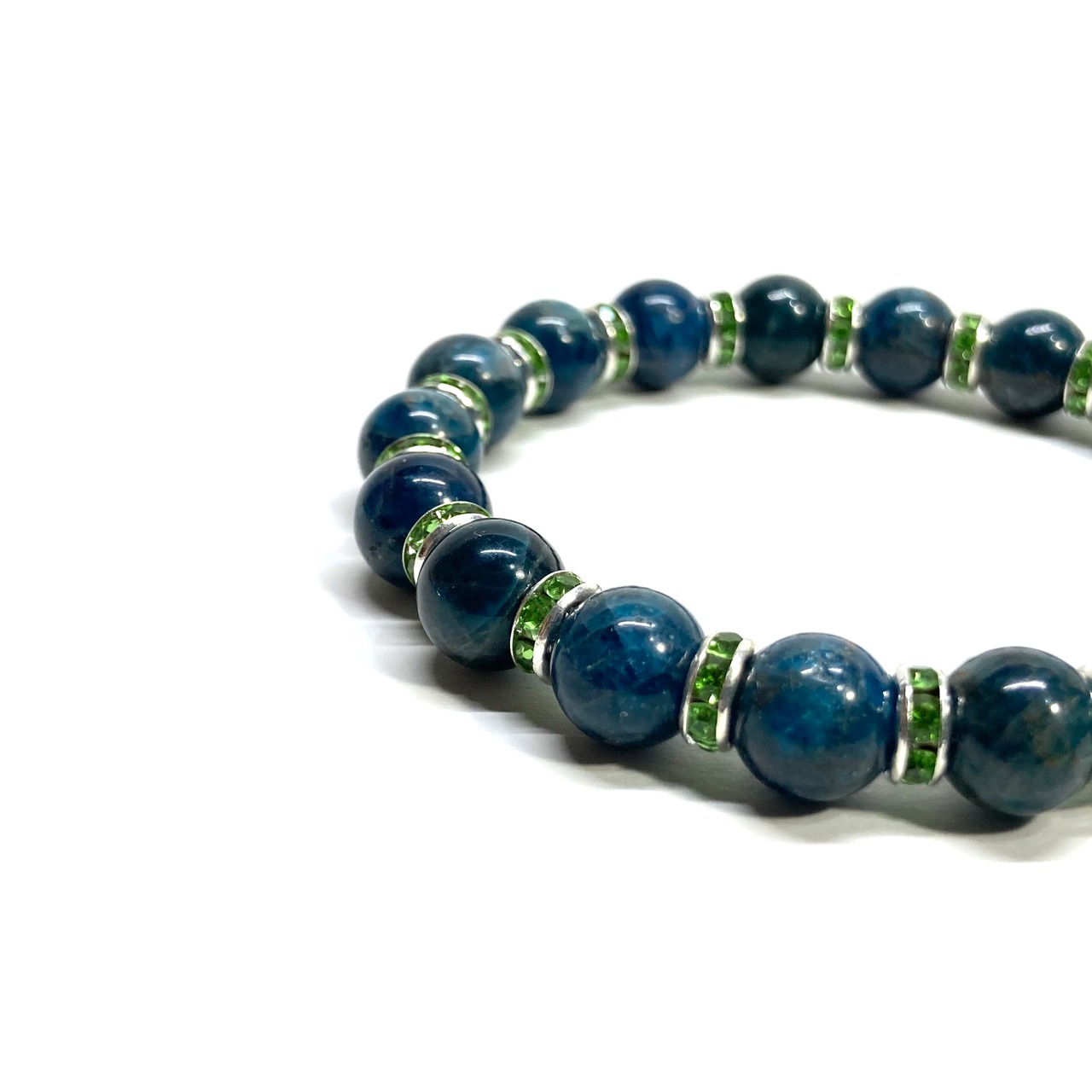 こちらは、アパタイトの8mm玉を使用したパワーストーンブレスレットです。石との間にはロンデルを挟み高級感を演出しております。シンプルなデザインは、シーン問わずどんなコーディネートとも合わせ易いブレスレットです。サイズは内周約15cm (手首周りを測り少し余裕をもってお買い求めくださいませ。)です。当社の中でも一番人気の実績があるデザインとなっております。気になる方はお早めにどうぞ。