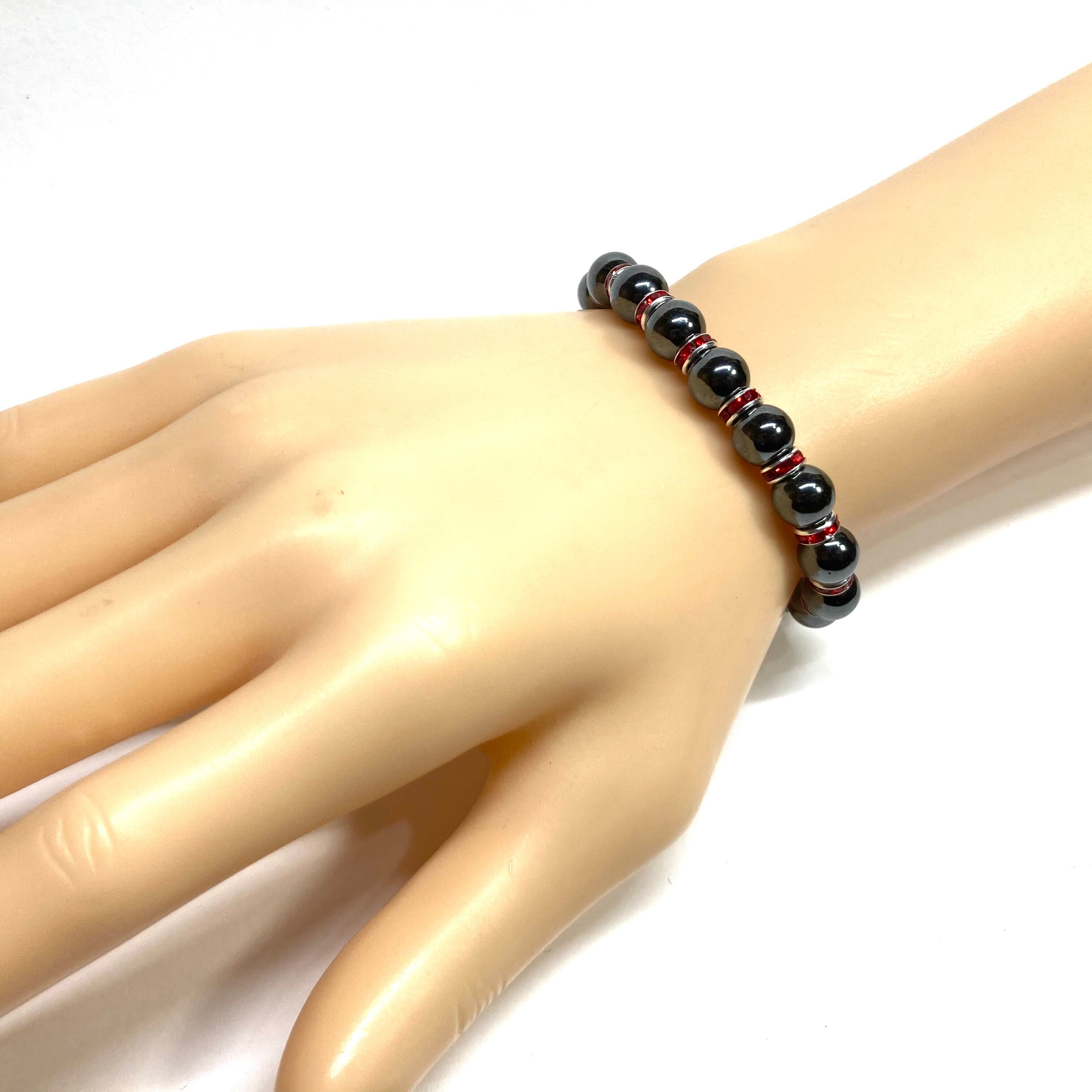 こちらは、ヘマタイトの8mm玉を使用したパワーストーンブレスレットです。石との間にはロンデルを挟み高級感を演出しております。シンプルなデザインは、シーン問わずどんなコーディネートとも合わせ易いブレスレットです。サイズは内周約15cm (手首周りを測り少し余裕をもってお買い求めくださいませ。)です。当社の中でも一番人気の実績があるデザインとなっております。気になる方はお早めにどうぞ。