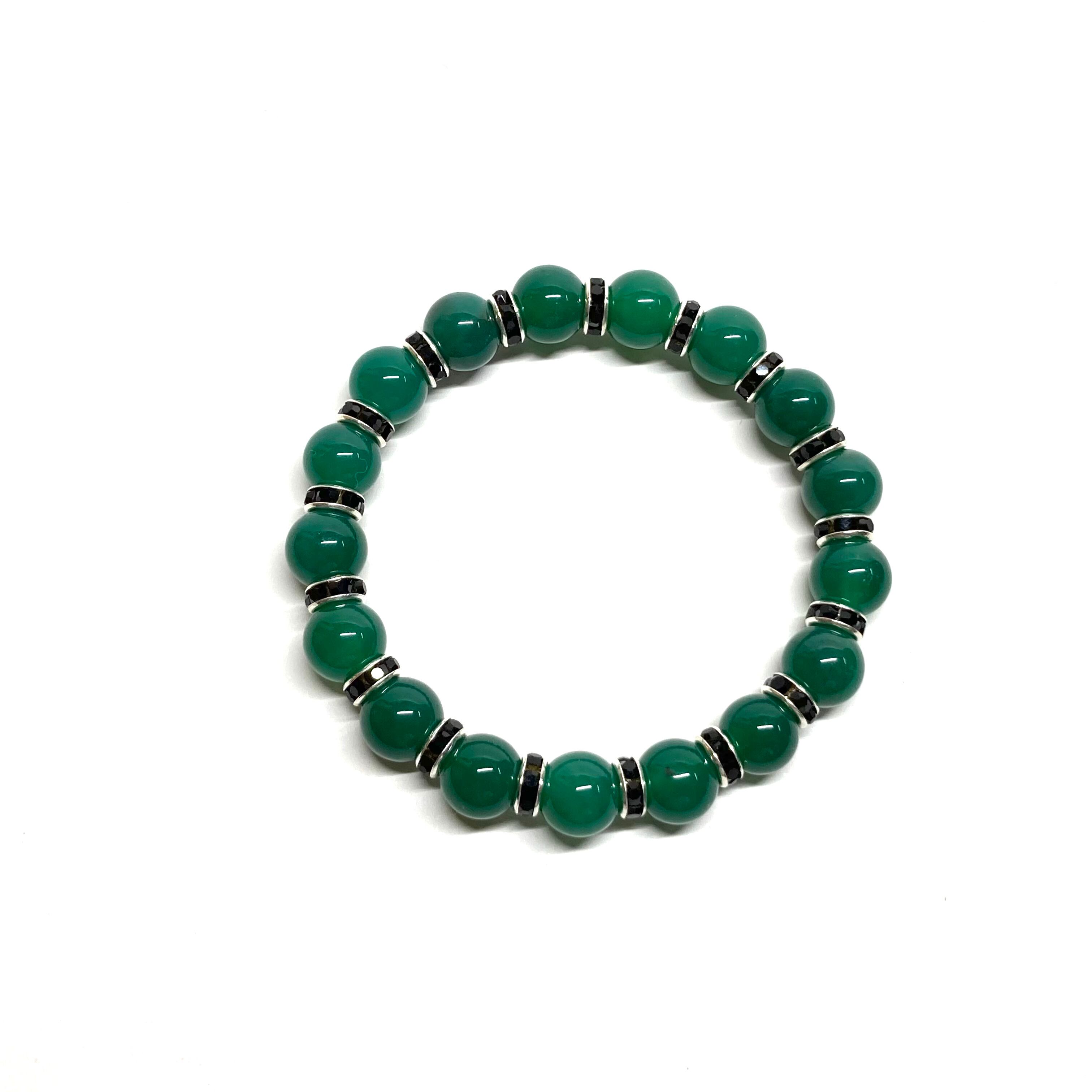 こちらは、緑瑪瑙の8mm玉を使用したパワーストーンブレスレットです。石との間にはロンデルを挟み高級感を演出しております。シンプルなデザインは、シーン問わずどんなコーディネートとも合わせ易いブレスレットです。サイズは内周約15cm (手首周りを測り少し余裕をもってお買い求めくださいませ。)です。当社の中でも一番人気の実績があるデザインとなっております。気になる方はお早めにどうぞ。