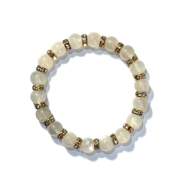 こちらは、ムーンストーンの8mm玉を使用したパワーストーンブレスレットです。石との間にはロンデルを挟み高級感を演出しております。シンプルなデザインは、シーン問わずどんなコーディネートとも合わせ易いブレスレットです。サイズは内周約15cm (手首周りを測り少し余裕をもってお買い求めくださいませ。)です。当社の中でも一番人気の実績があるデザインとなっております。気になる方はお早めにどうぞ。
