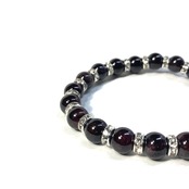 こちらは、ガーネットの8mm玉を使用したパワーストーンブレスレットです。石との間にはロンデルを挟み高級感を演出しております。シンプルなデザインは、シーン問わずどんなコーディネートとも合わせ易いブレスレットです。サイズは内周約15cm (手首周りを測り少し余裕をもってお買い求めくださいませ。)です。当社の中でも一番人気の実績があるデザインとなっております。気になる方はお早めにどうぞ。