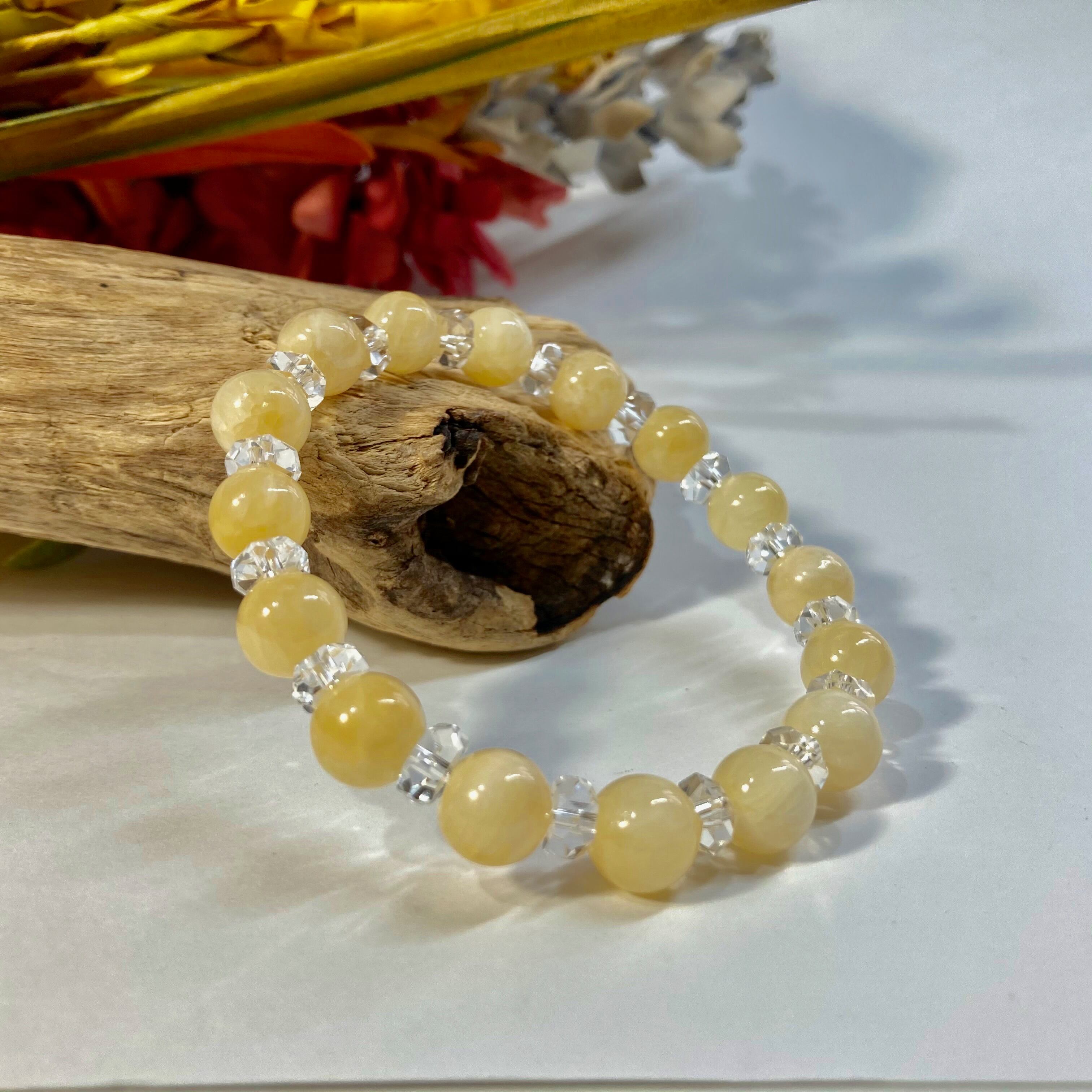 こちらは、アラゴナイトの8mm玉を使用したパワーストーンブレスレットです。今回は石との間にキラキラと輝きを見せるカットボタン水晶を使い、いつものブレスレットとはまた違った印象に仕上げています。内周15cmです。(サイズ変更は1cmあたり100円で承っております。サイズ変更の場合は金額変更しますのでメッセージにてご連絡くださいませ。)気になる方はお早めにどうぞ。