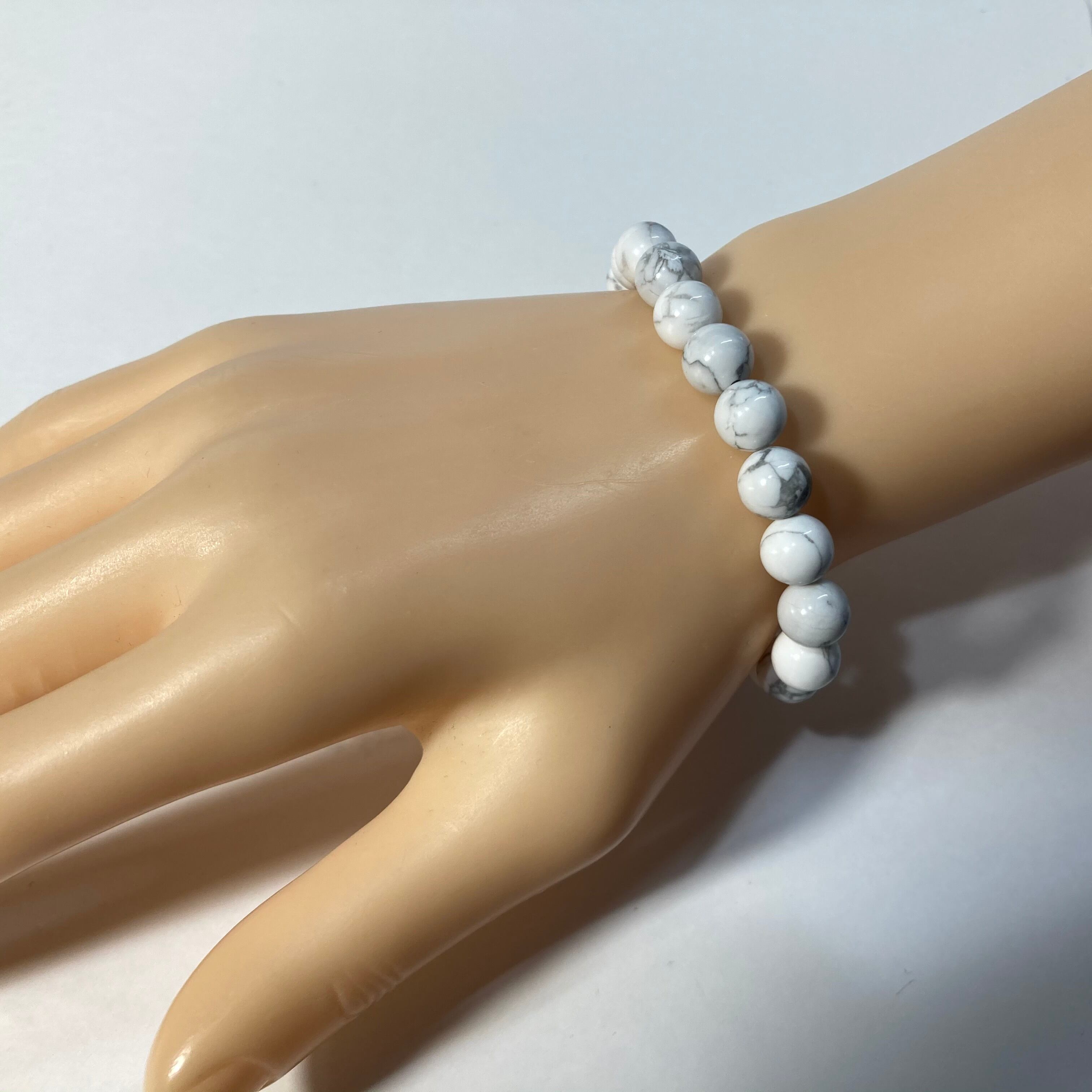 こちらは、ハウライトの8mm玉を使用したパワーストーンブレスレットです。シンプルなデザインは、シーン問わずどんなコーディネートとも合わせ易いブレスレットです。内周15cmです。(サイズ変更は1cmあたり100円で承っております。サイズ変更の場合は金額変更しますのでメッセージにてご連絡くださいませ。)気になる方はお早めにどうぞ。