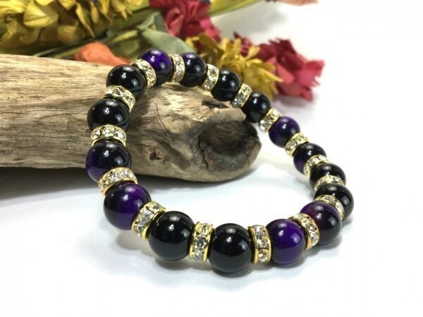 こちらは、パープルタイガーアイとオニキスを組み合わせたブレスレットです。間にはロンデルを挟み高級感あるデザインに仕上がっています。石大きさは腕にも馴染みやすいように10mm玉で内周約16cm(伸可能)です。数に限りがございますので気になる方はお早めにどうぞ。