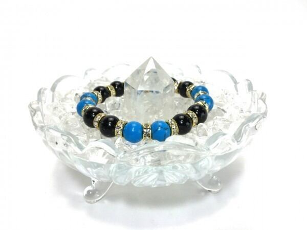 こちらは、ターコイズとオニキスを組み合わせたブレスレットです。間にはロンデルを挟み高級感あるデザインに仕上がっています。石大きさは腕にも馴染みやすいように10mm玉で内周約16cm(伸可能)です。数に限りがございますので気になる方はお早めにどうぞ。