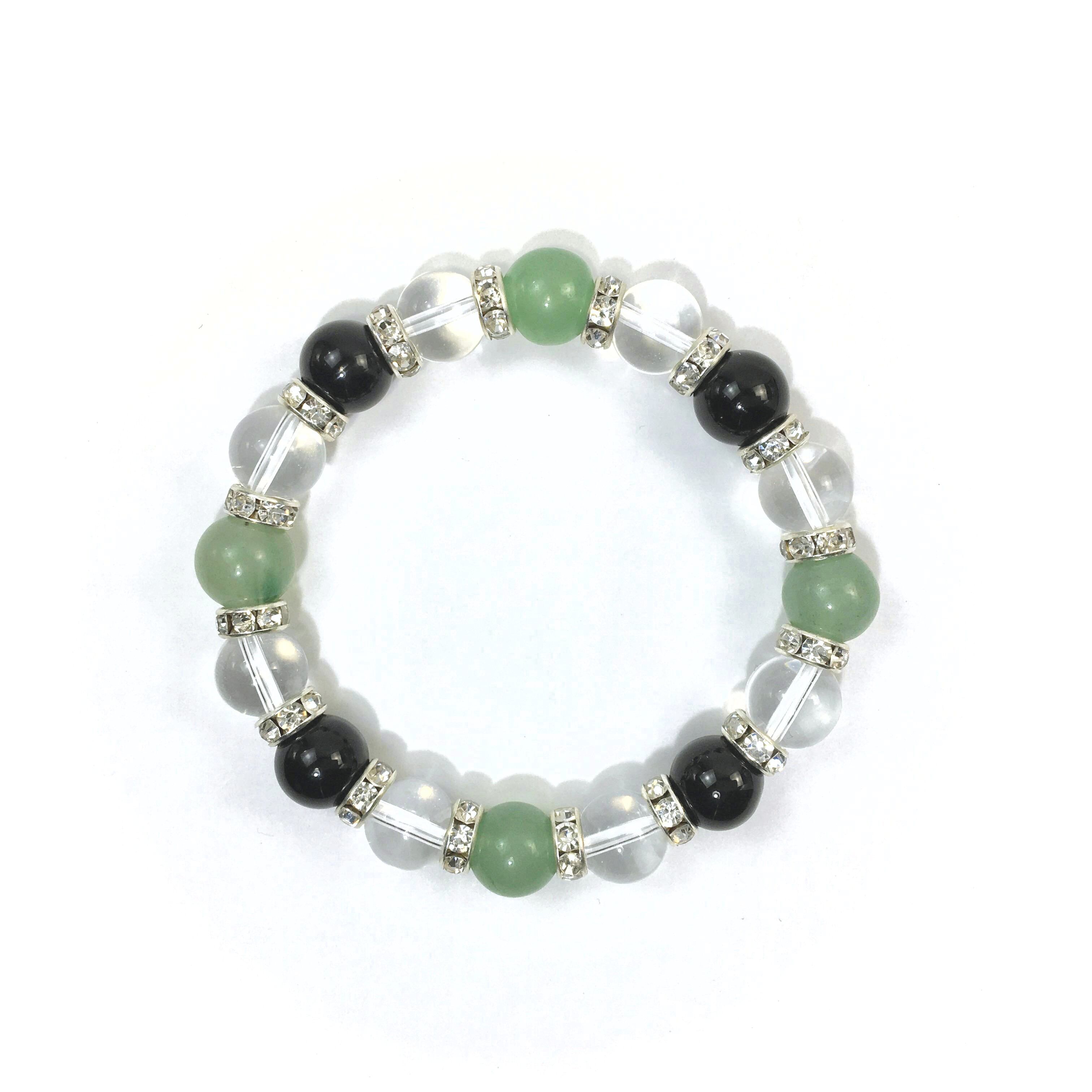 こちらは、アベンチュリンと水晶とオニキスを組み合わせたブレスレットです。間にはロンデルを挟み高級感あるデザインに仕上がっています。石大きさは腕にも馴染みやすいように10mm玉で内周約16cmです。数に限りがございますので気になる方はお早めにどうぞ。