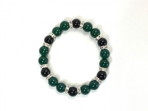 こちらは、緑瑪瑙とオニキスを組み合わせたブレスレットです。間にはロンデルを挟み高級感あるデザインに仕上がっています。石大きさは腕にも馴染みやすいように10mm玉で内周約17cm(伸可能)です。数に限りがございますので気になる方はお早めにどうぞ。