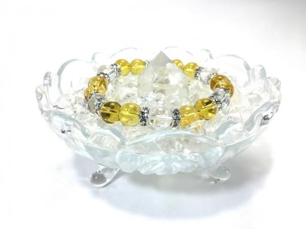 こちらは、シトリンと水晶を組み合わせたブレスレットです。間にはロンデルを挟み高級感あるデザインに仕上がっています。石大きさは腕にも馴染みやすいように10mm玉で内周約17cm(伸可能)です。数に限りがございますので気になる方はお早めにどうぞ。