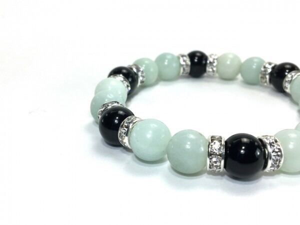 こちらは、アマゾナイトとオニキスを組み合わせたブレスレットです。間にはロンデルを挟み高級感あるデザインに仕上がっています。石大きさは腕にも馴染みやすいように10mm玉で内周約17cm(伸可能)です。数に限りがございますので気になる方はお早めにどうぞ。