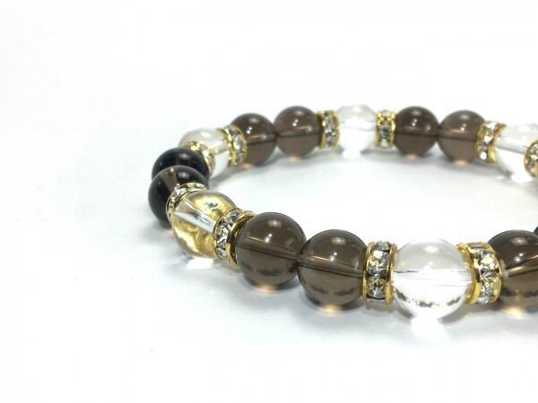 こちらは、スモーキークォーツと水晶を組み合わせたブレスレットです。間にはロンデルを挟み高級感あるデザインに仕上がっています。石大きさは腕にも馴染みやすいように10mm玉で内周約17cm(伸可能)です。数に限りがございますので気になる方はお早めにどうぞ。