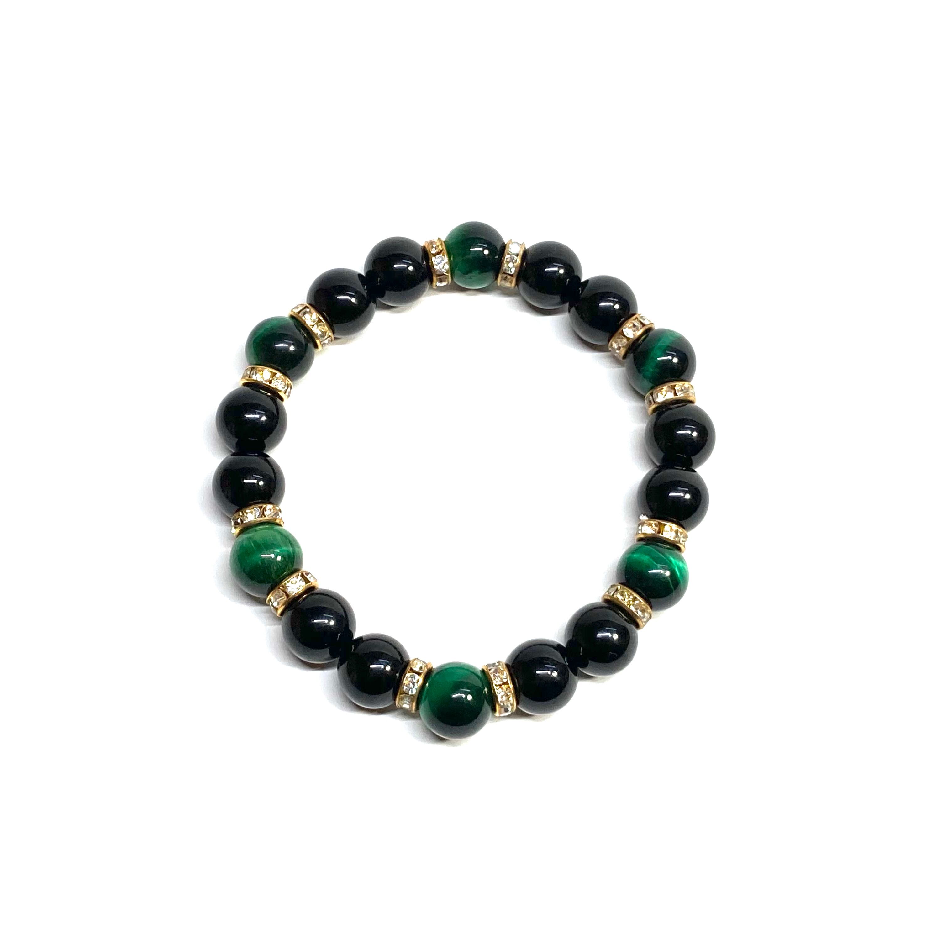こちらは、モリオンとグリーンタイガーアイを組み合わせたパワーストーンブレスレットです。間にはロンデルを挟み高級感あるデザインに仕上げております。石大きさは腕にも馴染みやすいように10mm玉で内径約18cm(伸可能)です。 数に限りがございますので気になる方はお早めにどうぞ。